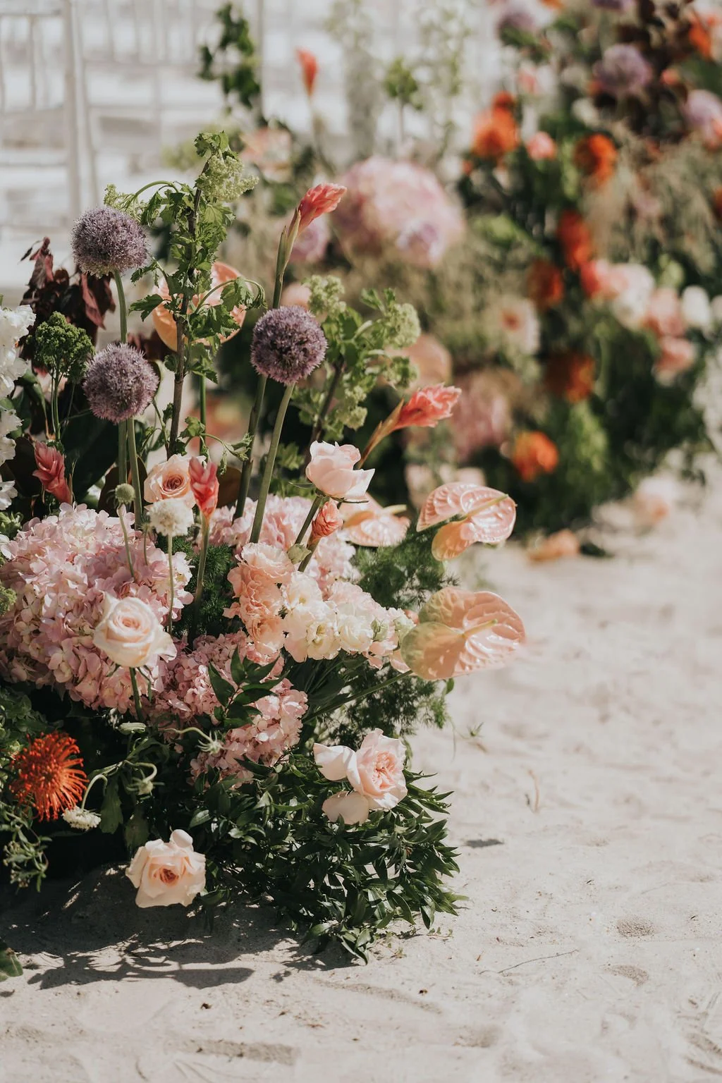 The beachside ceremony featured sculptural floral pillars crafted entirely from fresh seasonal blooms. These stunning florals made a second appearance at the evening reception, where they were artfully repurposed to carry the design language throughout the day.