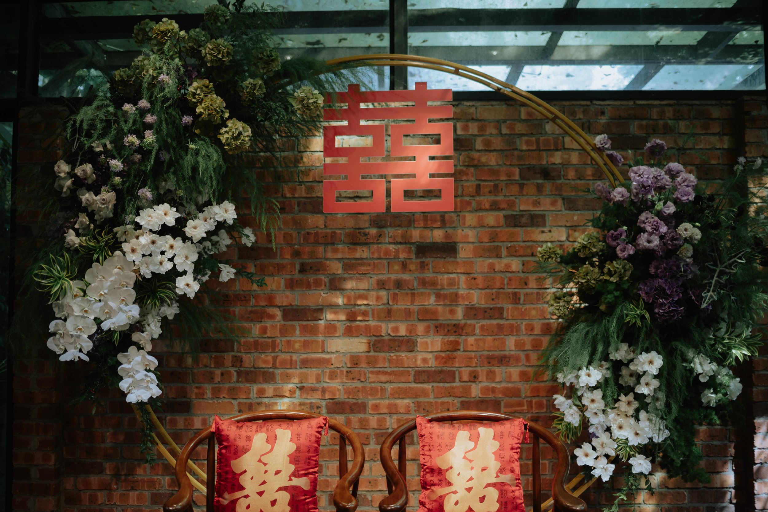 We went with natural elements to complement glasshouse’s raw brick wall and wood flooring. A circular ratan structure, complete with overgrown floral arrangements, wooden twin chairs, and a double happiness signage.